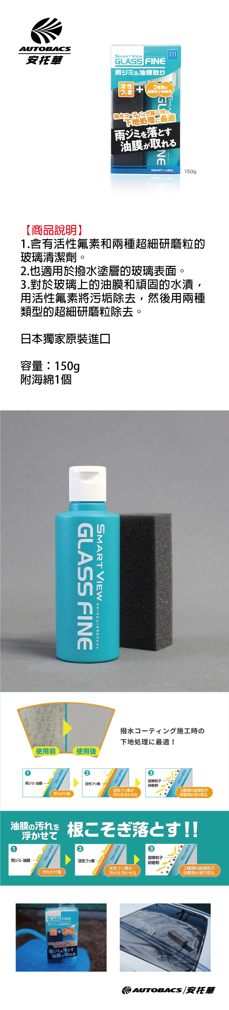 日本進口專業玻璃除油膜組合,內含高效除油膜劑與專用清潔布,輕鬆去除玻璃表面油膜、